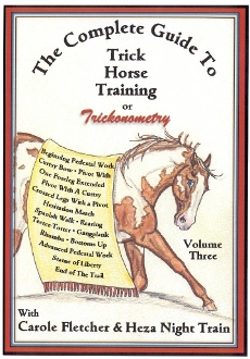 From there, the pedestal is going to get more challenging, but even more sensational. Starting with three poses, the Statue of Liberty, End of the Trail, and Bottoms Up, Carole shows you how to teach these to your horse while in hand, and then with you aboard. You’ll also see how after working on the larger pedestal, your horse will eventually be comfortable working on a smaller version that really showcases his agility and sense of balance. This pedestal work continues with previous tricks learned on the ground, that are now performed on the pedestal: the pivot with one leg extended, and crossed legs with a pivot and curtsy. More “business” is added with work on a teeter-totter and gangplank. Heza Night Train shows his Latin lover side when he and Carole demonstrate the way to dance a four-footed Rhumba! Volume Three concludes with Rearing. Carole cautions that this is a trick that can become a bad habit, so it’s important that you and your horse know the tricks in the first two Volumes before progressing to this one. With this knowledge, and the 3 “P’s,” Patience, Perseverence and Praise, your horse will be rearing, doing the “high three,” and walking on his hind legs calmly and under total control.
